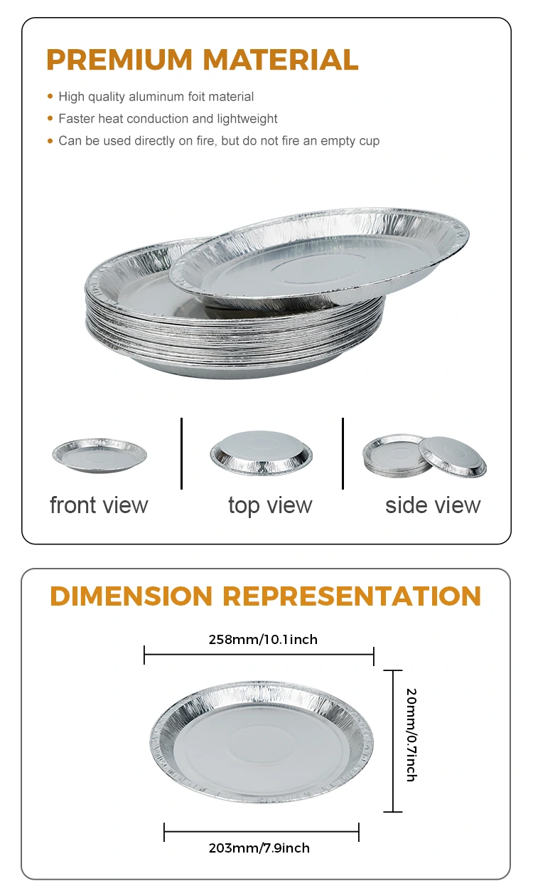 فویل آلومینیومی Yunchu یک ظروف فویل آلومینیومی پیتزا 10 اینچ پیتزا با شماره مدل 13110 ارائه می دهد. این محصول دارای قطر بالایی 258 میلی متر (حدود 10.1 اینچ) ، قطر پایین تر 203 میلی متر (حدود 7.9 اینچ) و ارتفاع 20 میلی متر (حدود 0.7 اینچ) است. با ظرفیت تقریبی 695 میلی لیتر (حدود 24.5 اونس) ، برای پخت پیتزا بدون چسبیدن مناسب است ، آزاد شدن از قالب آسان است و هیچ بو ندارد. علاوه بر این ، طراحی لبه بلند آن مانع از ریختن مواد تشکیل دهنده و افزایش عملی می شود. ما همچنین می توانیم خدمات سفارشی سازی آرم را ارائه دهیم تا به شما در تعمیق تصور مشتریان و ارتقاء آگاهی از برند خود کمک کنیم.