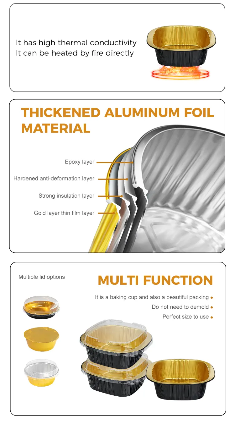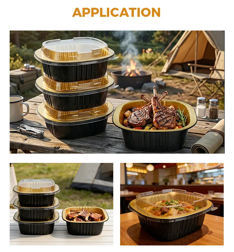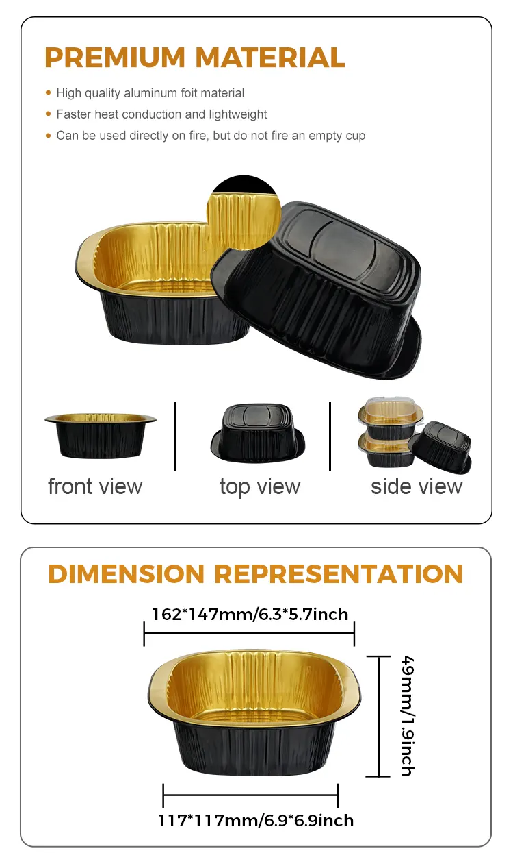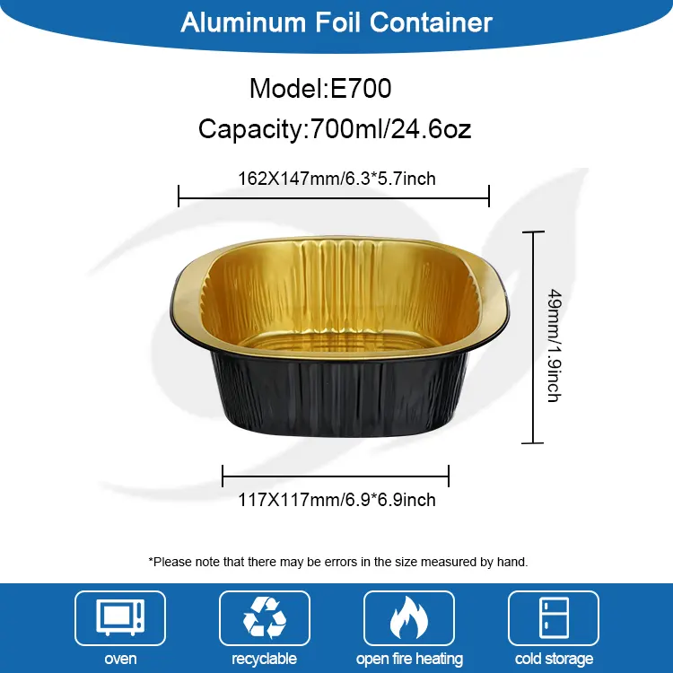 ظروف فویل آلومینیومی یکبارمصرف جعبه دو گوش مربعی طلای مشکی تامین کننده فویل آلومینیومی از فویل آلیاژ آلومینیوم 8011 درجه مواد غذایی ساخته شده است. آنها با فرآیندهای بازپخت و استریل کردن در دمای بالا درمان شده اند تا یک لایه اکسید متراکم روی سطح تشکیل دهند. آنها فلزات سنگین و بو ندارند. آنها می توانند به طور مستقیم با انواع مواد غذایی در تماس باشند و از رسوب مواد مضر در دمای بالا جلوگیری کنند. چه از آنها برای نگهداری ظروف گرم، چه غذاهای سرد، دسرها یا سس ها استفاده شود، می توانند از ایمنی مواد غذایی محافظت کنند و با چندین گواهینامه ایمنی مانند FDA و SGS مطابقت داشته باشند و هر لقمه ای را ایمن تر کنند. طراحی منحصر به فرد دیوار لایت طلای سیاه، بافت یکنواخت ظروف فویل آلومینیومی سنتی را می شکند. پوشش طلای مشکی مات و سطح دیوار صاف حسی عالی را به ارمغان می آورد. نه تنها ظاهر برجسته ای دارد، بلکه می تواند به طور موثر نور و اکسیژن را مسدود کند، اکسیداسیون غذا را به تاخیر بیندازد، عطر و رطوبت غذا را محکم ببندد، از انتقال بو جلوگیری کند و طعم اصلی غذا را برای مدت طولانی حفظ کند. سطح صاف دیوار هیچ شیار یا چین و چروکی ندارد، بنابراین احتمال تولید باکتری کمتر است و به راحتی تمیز می شود. همچنین می‌تواند بهتر با سفارشی‌سازی چاپ سازگار شود و به برندهای کیترینگ کمک کند تا شناخت و کیفیت خود را افزایش دهند.