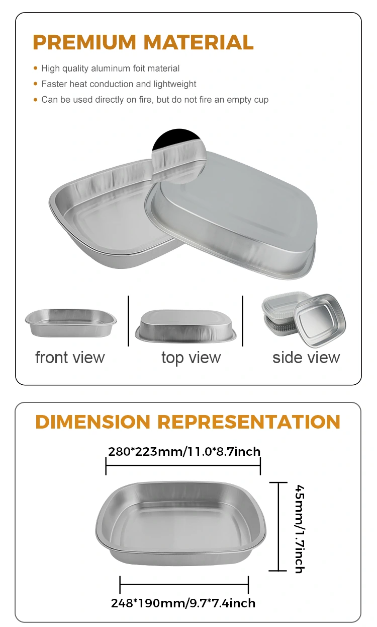 4. تابه های غذاخوری فویل آلومینیومی برش مربعی Takeaway دارای خطوط ساده و منظمی است که با درخشندگی نقره ای مدرن تکمیل شده است. این می تواند جذابیت بصری غذا و کیفیت کلی آن را افزایش دهد و به تقویت تصویر حرفه ای و مجلل برند کمک کند.