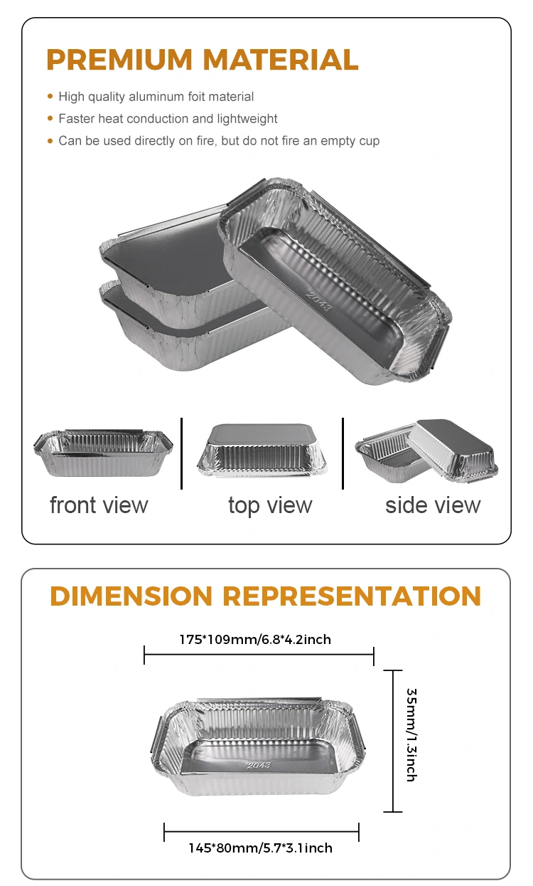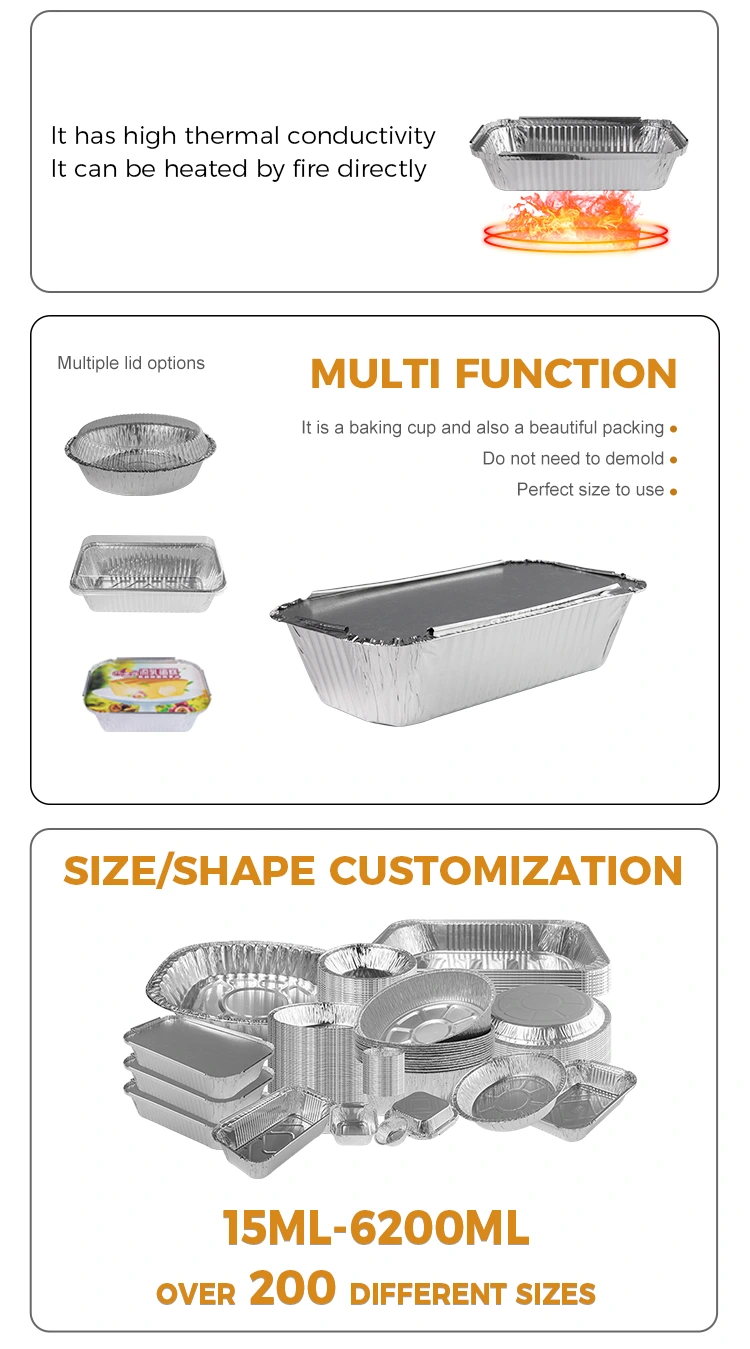 این ظروف فویل آلومینیومی نقره ای جعبه فست فود یکبار مصرف یکبار از مواد فویل آلومینیومی با کیفیت بالا 8011 ساخته شده است که دارای اثر حفظ حرارت خوبی است و می تواند دمای غذا را حفظ کند و غذا را خوشمزه تر و خوشمزه تر می کند. علاوه بر این ، ظروف فویل آلومینیومی نقره ای مستطیل BBQ ما نیز مجهز به یک عملکرد عایق حرارتی است که می تواند با درب فویل آلومینیومی یا درب پلاستیکی PET جفت شود ، که برای آرم سفارشی مناسب است و بیشتر تصویر برند را تقویت می کند.