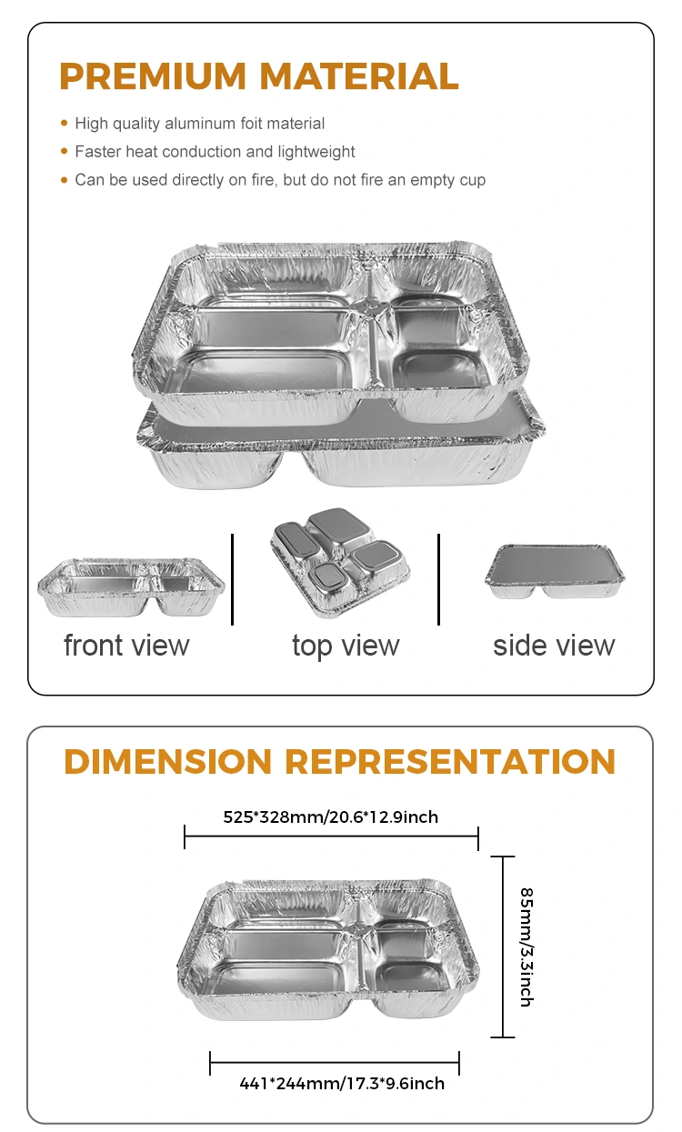 یکبار مصرف چند محفظه فست فود فست فود نقره ای آلومینیوم نقره ای با درب های کاغذی به دلیل خاصیت حفظ گرمای خوب در پاییز و زمستان عملکرد خوبی دارند. این که آیا این یک خورش داغ تازه یا غذای گرم دیگر است ، می تواند برای مدت طولانی دمای مناسب را حفظ کند و به مصرف کنندگان این امکان را می دهد تا از غذای گرم لذت ببرند.