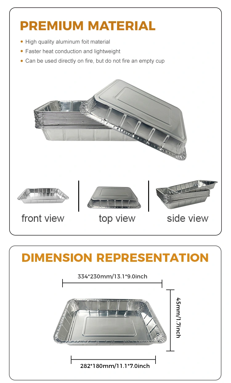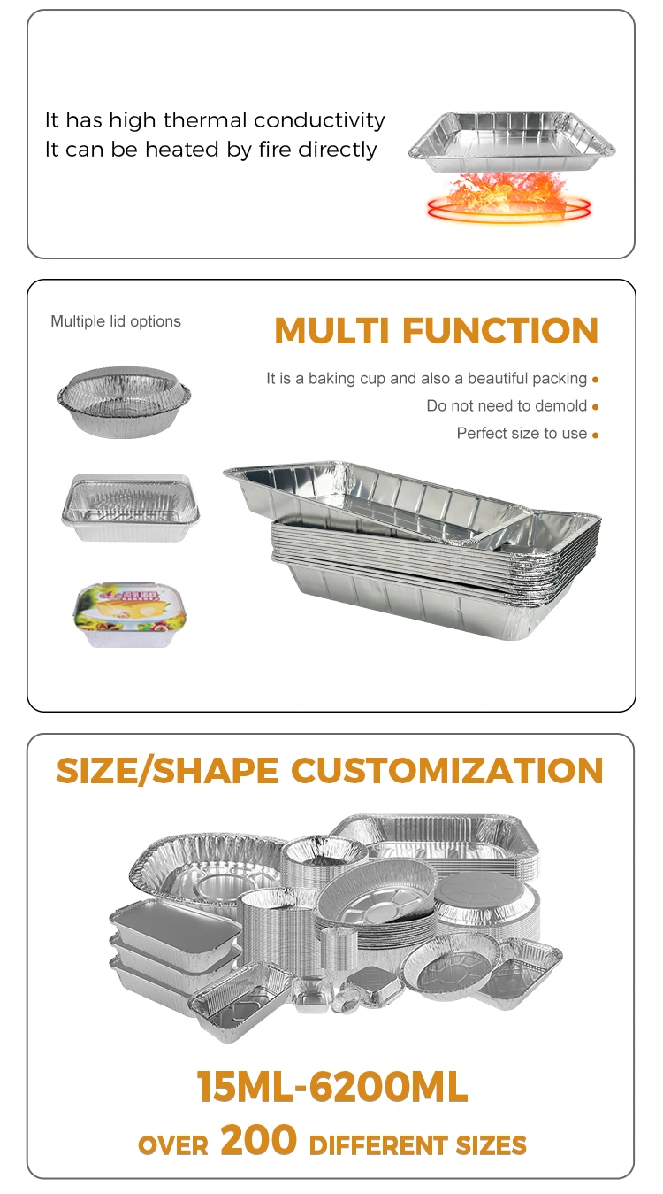 Yunchu Aluminum Foil Wholesale Model YF2400 Large grilled fish takeaway Silver Aluminum Foil Containers is suitable for all kinds of large baking equipment, such as baking ovens, retort boxes and barbecue grills, etc. This product is designed for disposable barbecue takeaway, can withstand high temperatures and make large cakes, suitable for placing food directly on the baking sheet for steaming, not only does not stick to the plate و سوزاندن آسان نیست ، اما همچنین می تواند مستقیماً با شعله باز تماس بگیرد. این محصول برای اطمینان از استفاده ایمن ، گواهینامه های ملی مربوطه را تصویب کرده است. علاوه بر این ، از مقاومت در برابر حرارت بسیار عالی برخوردار است و می تواند در دماهای بالا پایدار بماند ، تغییر شکل یا ترک آن آسان نیست. برای اطمینان از ایمنی و قابلیت اطمینان محصول ، آزمایش داخلی دقیق انجام دهید.