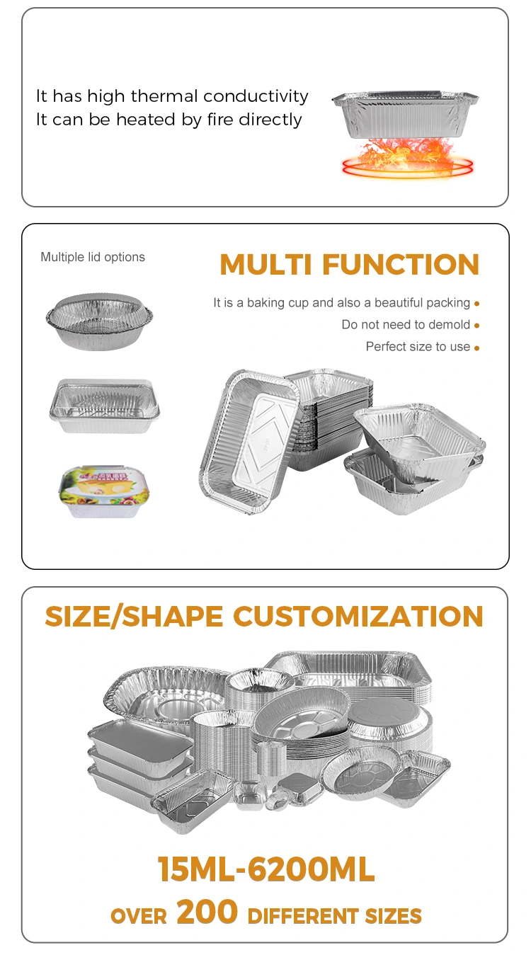 جعبه های ناهار فویل آلومینیومی که ما ارائه می کنیم از مواد فویل آلومینیومی 8011 ساخته شده اند که دارای خواص عایق حرارتی عالی است و می تواند به طور موثر دمای غذا را حفظ کند. به طور خاص، ظرف فویل آلومینیومی مستطیلی ما برای پخت جعبه‌های ناهار نه تنها دارای خواص حفظ حرارت است، بلکه می‌تواند با درب فویل آلومینیومی نیز برای تسهیل سفارشی‌سازی شخصی لوگو استفاده شود.