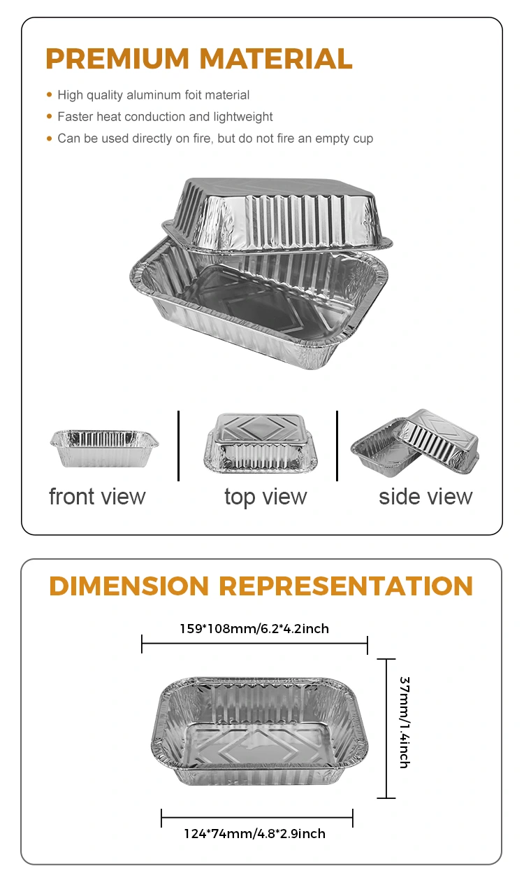 ظروف فویل نقره ای پخت مستطیل 2322 از تأمین کننده فویل آلومینیومی Yunchu با مواد فویل آلومینیومی درجه مواد غذایی ساخته شده است و از ایمنی و ماهیت بدون بو مواد غذایی اطمینان حاصل می کند. این محصول بدون تمیز و قابل بازیافت است و هنگام استفاده از آن آرامش بیشتری به شما می دهد. دارای ابعاد 159 میلی متر (6.2 اینچ) و 108 میلی متر (4.2 اینچ) قطر فوقانی ، 124 میلی متر (4.8 اینچ) و 74 میلی متر (2.9 اینچ) قطر پایین ، 37 میلی متر (1.4 اینچ) و ظرفیت تقریبا 400 میلی لیتر (14.1 اونس) است. جعبه های فویل آلومینیومی دارای عملکردهای عالی برای حفظ گرما هستند ، به خصوص برای کنترل دما در غذای غذای آماده و مرکز خرید ، چه کیک های کوچک یا مواد میوه ای مناسب هستند.