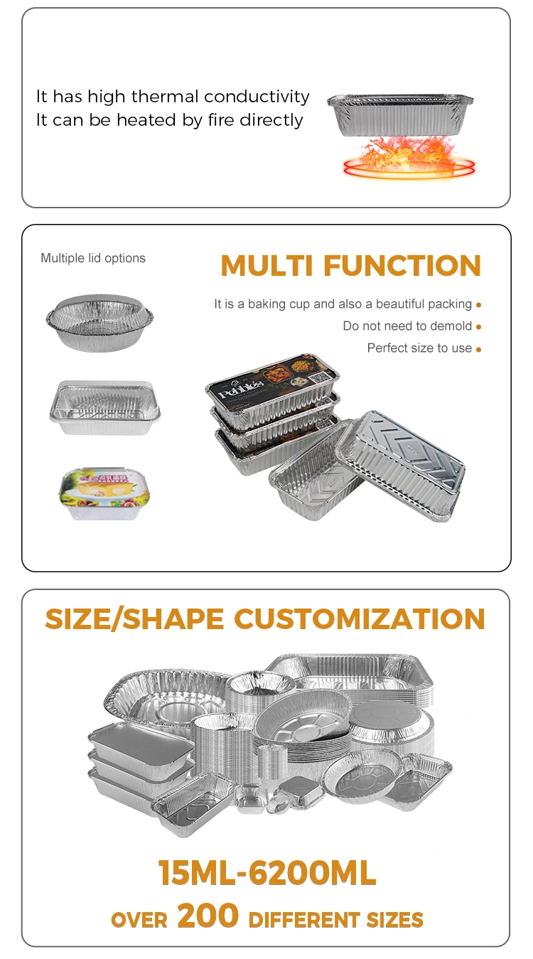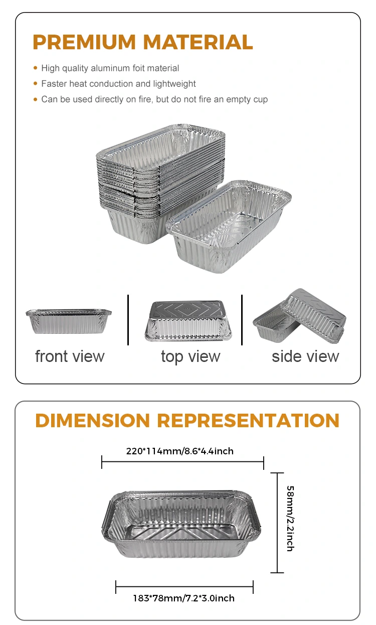 Yunchu aluminum foil supplier, Rectangular barbecue thickened Silver Aluminum Foil Containers, long-lasting baking resistant open flame available, upgraded height to prevent touching the wall of the pot, heightened design to prevent soup from flowing out, food is not easy to stick, easier to take, smooth edge use without cutting hands, inward folding edge to prevent cutting hands Details are treated carefully, direct contact with containers, can be used as edible containers, استفاده یک بار بدون نگرانی و تمیز کردن ، بدون نیاز به تمیز کردن و بهداشتی پس از استفاده ، از ارزش بازیافت جعبه فویل آلومینیومی کثیف استفاده می شود ، از نظر کنترل کیفیت ، ما هر مرحله از تولید را کاملاً نظارت می کنیم تا اطمینان حاصل کنیم که همه محصولات مطابق با استانداردهای ایمنی ملی هستند. این شرکت گواهی ایمنی مواد بسته بندی مواد غذایی آلومینیومی را که توسط ایالت صادر شده است ، به دست آورده و صدور گواهینامه ERP آلمان ، صدور گواهینامه EU SGS و صدور گواهینامه ISO9001 را تصویب کرده است.