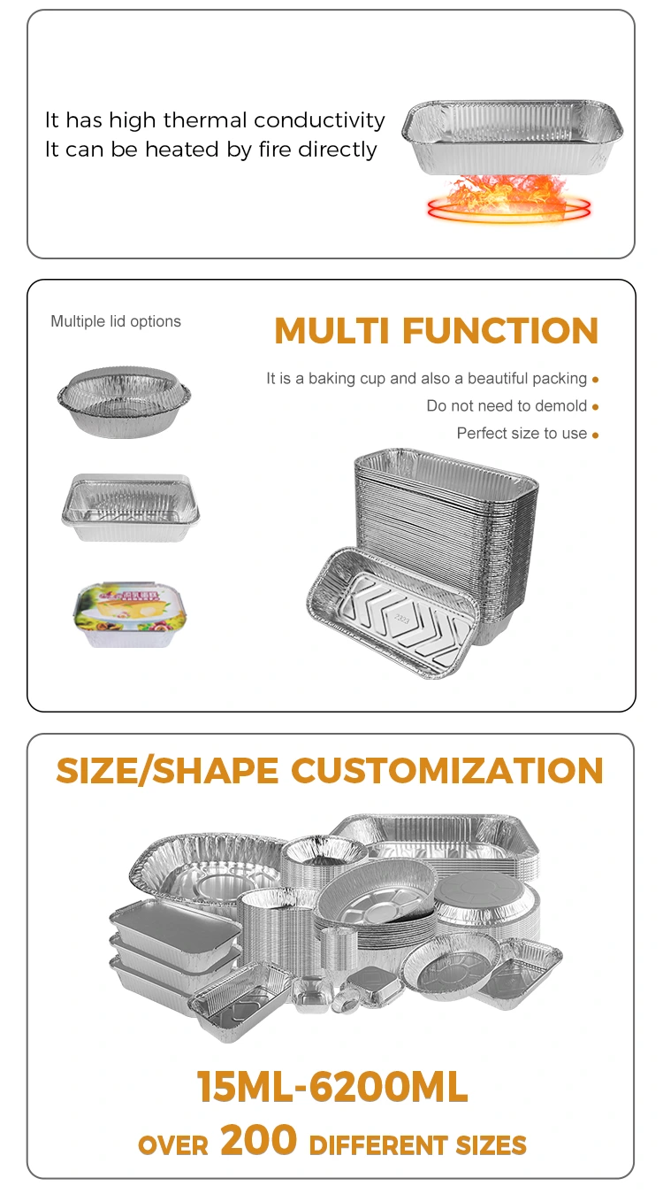 ویژگی ها: جعبه ناهار عمده فروشی 8011 مواد فویل آلومینیومی از حفظ حرارت خوب ساخته شده است که می تواند دمای غذا را حفظ کرده و غذا را خوشمزه تر کند. علاوه بر این ، ظروف فویل آلومینیومی نقره ای مستطیل ما نیز دارای یک عملکرد حفظ گرما است که می تواند با درب کاغذ فویل آلومینیومی و درب پلاستیکی حیوان خانگی مطابقت داشته باشد ، که برای شما مناسب است که آرم خود را سفارشی کنید ، بیشتر تصور مشتری را عمیق تر کنید و تصویر برند خود را تقویت کنید.