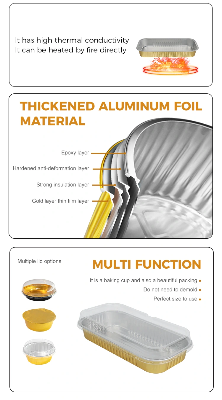 رسانایی حرارتی عالی مواد فویل آلومینیومی باعث می شود که حرارت فر به سرعت و به طور یکنواخت به داخل غذا منتقل شود و از مشکلات سوزاندن موضعی یا ساندویچ جلوگیری شود. هنگام پخت شیرینی‌های طولانی، بدنه جعبه کاملاً با شکل غذا مطابقت دارد و رطوبت و عطر را حفظ می‌کند. هنگام پخت، بیرون از بیرون ترد و داخل آن نرم است. طعم آن به مراتب بهتر از ظروف شیشه ای یا پلاستیکی معمولی است. لبه های جعبه گرد است که ضد خش است و به طور موثری از نشت سوپ جلوگیری می کند. ظروف فویل آلومینیومی صاف و طلایی شکل مستطیلی برای غذاهای لذیذ پخته شده با سس (مانند شکلات گدازه، رول آجیل کاراملی) مناسب است.