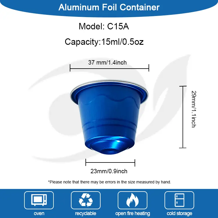 تأمین کنندگان فویل آلومینیومی Yunchu کپسول قهوه خالی مخروطی C15A را ارائه می دهند که برای اکثر دستگاه های کپسول قهوه مناسب است ، که می تواند برای بسته بندی مایع اسپرسو استفاده شود و حتی با شستشوی نیتروژن ماندگاری را افزایش دهد. علاوه بر این ، آرم و رنگ ها را می توان سفارشی کرد و الگوهای را می توان روی مهر و موم فویل آلومینیومی چاپ کرد و مهر و موم آرم را نیز می توان در پایین کپسول قهوه انجام داد. ابعاد کپسول به شرح زیر است: قطر بالا 37 میلی متر (تقریبا 1.4 اینچ) ، قطر پایه 23 میلی متر (تقریبا 0.9 اینچ) ، ارتفاع 29 میلی متر (تقریبا 1.1 اینچ).