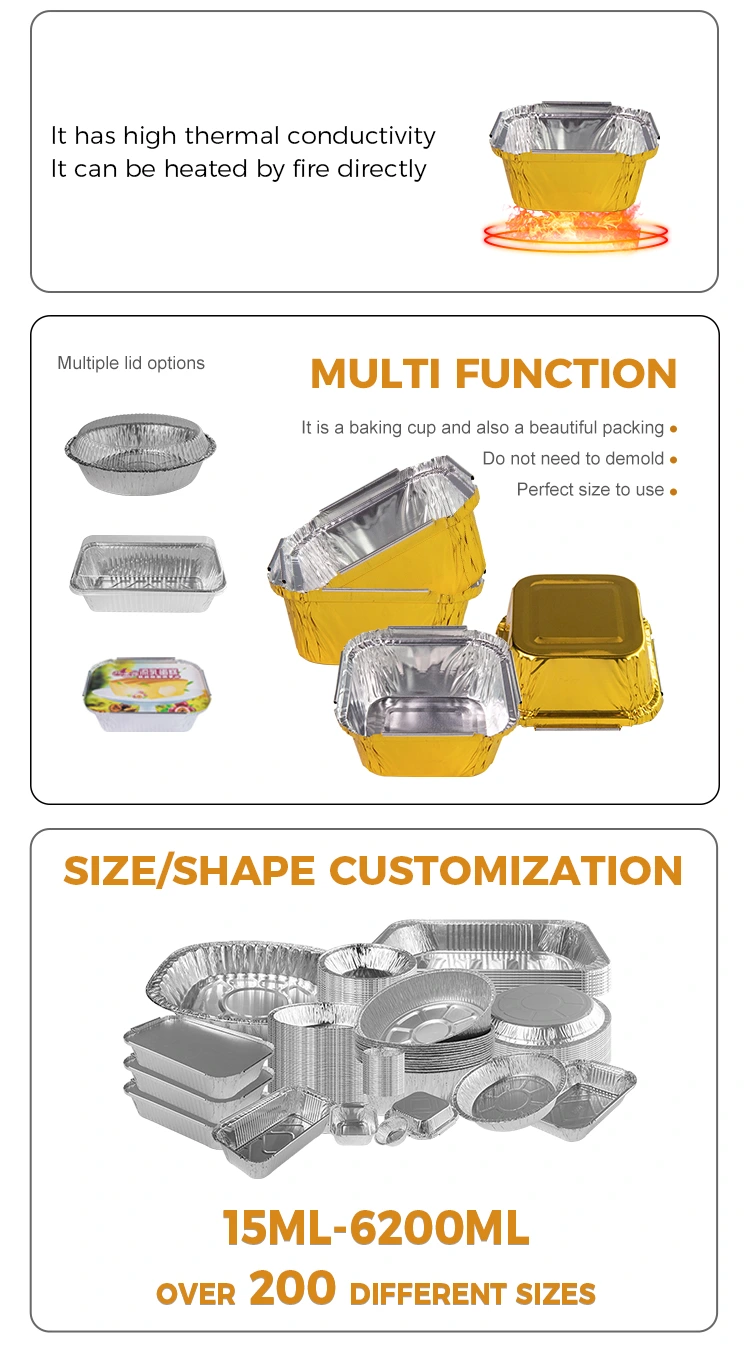 ​Yunchu aluminum foil Square baking oven Silver Aluminum Foil Containers protector is no-wash and multi-frying, waterproof and oil-draining, no need to clean, oven, air fryer, barbecue, steaming special, thickened material repeatedly used without deformation, the material is thick and can be cleaned with water, repeated use without pressure, can be matched with a variety of foods, such as baked cakes, cereal تخم مرغ های خشک شده ، بخارپز ، پودر ، پخت پودینگ ، سالاد میوه و غیره ، ایمن برای ورود به مواد درجه تماس با مواد غذایی ، Yunchu به طور جدی الزامات انتخاب مواد بهداشتی درجه یک مواد غذایی را به طور عمده دنبال می کند ، یعنی قالب ها نیز بسته بندی می شوند ، سرویس پوشش فویل آلومینیومی نیز با استفاده از یک MOQ سفارشی مجرد 3000 قطعه ، سفارشات را می پذیرد.